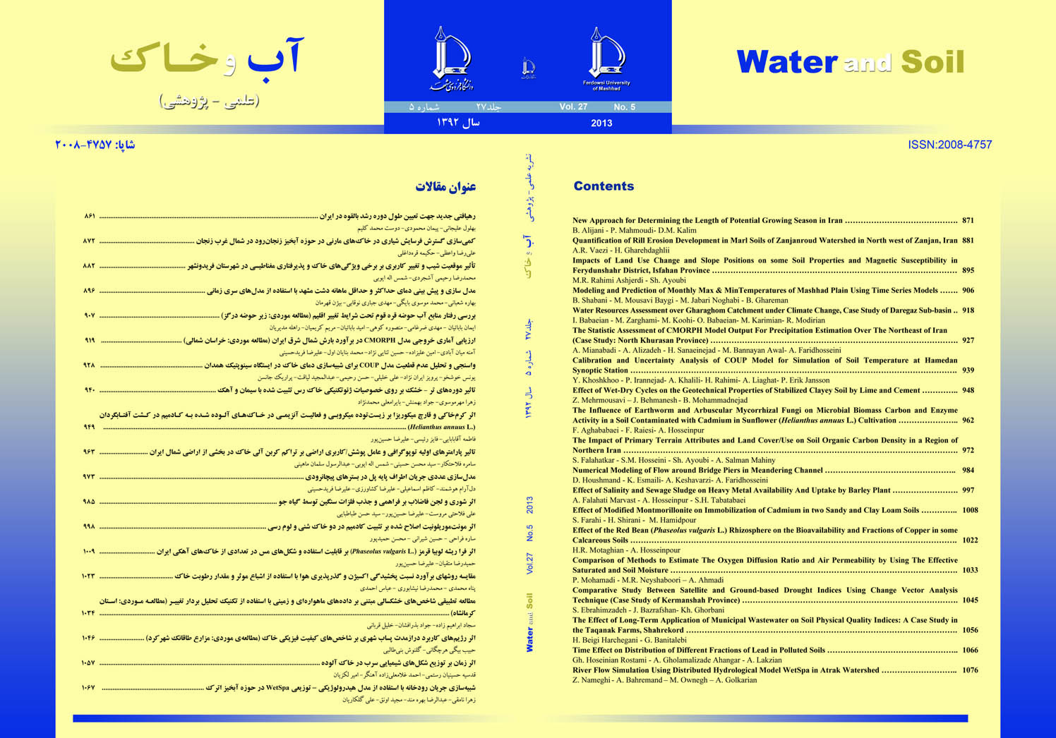 به منظور ارزیابی اثرات آبیاری درازمدت با پساب (13 و 23 سال) بر بعضی شاخص های فیزیکی کیفیت خاک، چهار مزرعه در منطقه ی طاقانک با تاریخچه های متفاوت آبیاری با پساب شهری و آب چاه انتخاب شد. در این مزارع، تغییرات شاخص های مرسوم فیزیکی خاک (کربن آلی، جرم ویژه ی ظاهری و میانگین وزنی قطر خاکدانه ها( و نیز شاخص های مستخرج از منحنی رطوبتی (شاخص Sدکستر، ...  بیشتر